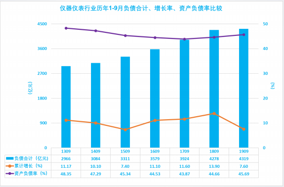2.10 儀器儀表行業(yè)歷年1-9月負(fù)債合計(jì)、增長(zhǎng)率、資產(chǎn)負(fù)債率比較