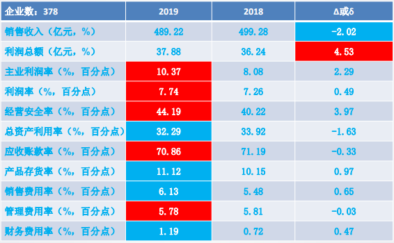 11個(gè)經(jīng)濟(jì)運(yùn)行指標(biāo)中:銷(xiāo)售收入、利潤(rùn)總額、主業(yè)利潤(rùn)率、經(jīng)營(yíng)安全率、應(yīng)收賬款率、產(chǎn)品存貨率和管理費(fèi)用率好于上年同期;其余4個(gè)指標(biāo)差于上年同期。