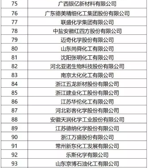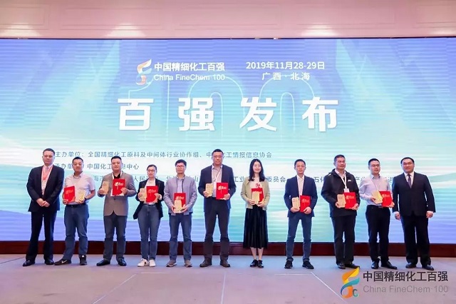 2019年11月28日,在由全國精細化工原料及中間體行業(yè)協(xié)作組、中國化工情報信息協(xié)會在廣西北海聯(lián)合主辦,中國化工信息中心承辦,北海市鐵山港區(qū)人民政府、北海市鐵山港(臨海)工業(yè)區(qū)管理委員會協(xié)辦的“第十九屆國際精細化工原料及中間體(鐵山港)峰會暨2019中國精細化工百強發(fā)布會”上,公布了“2019中國精細化工百強”榜單。