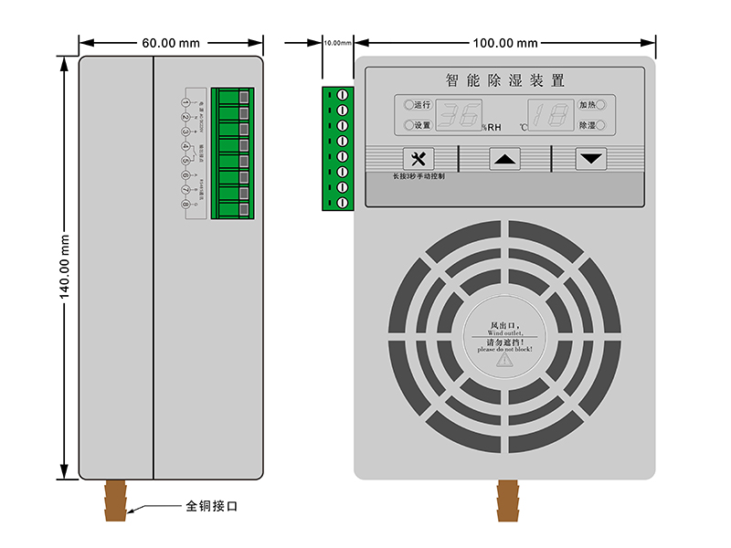 10、型號帶“T”的具有加熱功能,當(dāng)檢測到箱體環(huán)境溫度低時,除濕裝置內(nèi)部的風(fēng)機和外部加熱器啟動工作。